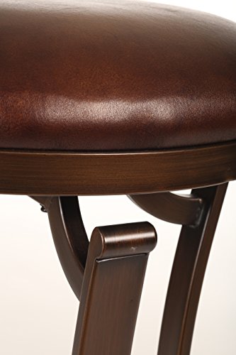 - Backless and simple in design, swivel counter stool with antique bronze finish and antique brown faux leather seat