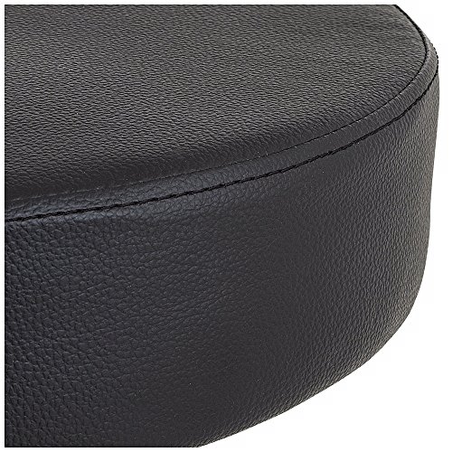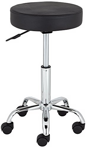The round seat of this multipurpose adjustable height stool is upholstered in black vinyl. The gentle curves of the chrome finish legs are accented with black, rolling wheel feet. The height adjustment handle is located just below the seat, making it...