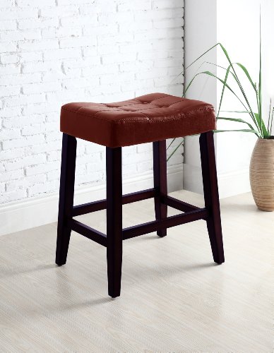 Faux leather upholstered saddle stools are a great addition to any space. Stools feature button tufted seats and wood bases.