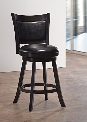 This Swivel Stool in Cappuccino finish features Solid hardwood construction, Black faux leather seat over high-density foam, Durable ball-bearing for full, 360 degree swivel, and Flared legs and footrest provide comfort and stability. Attractive desi...