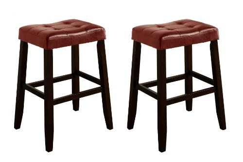 Faux leather upholstered saddle stools are a great addition to any space. Stools feature button tufted seats and wood bases.