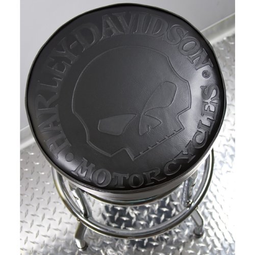 Mount this plush seat and enjoy a cool, refreshing beverage. Premium quality Harley-Davidson bar stool is constructed from a heavy-gauge 1in. tubular steel frame with lustrous chrome-plated finish. Commercial-grade vinyl covering is screened on the u...